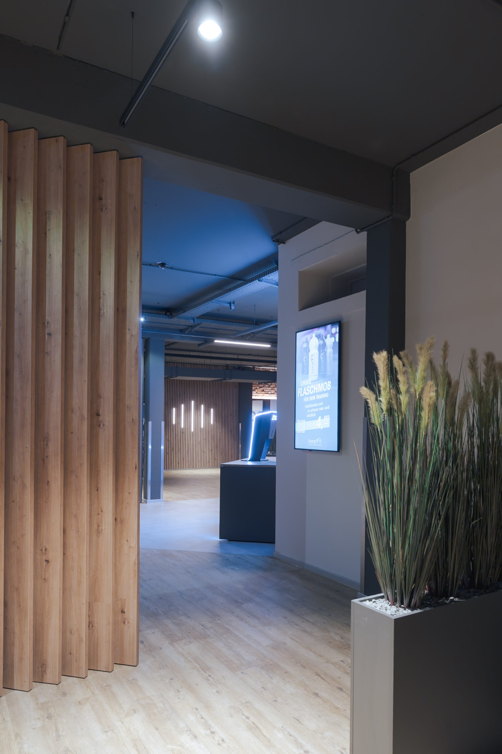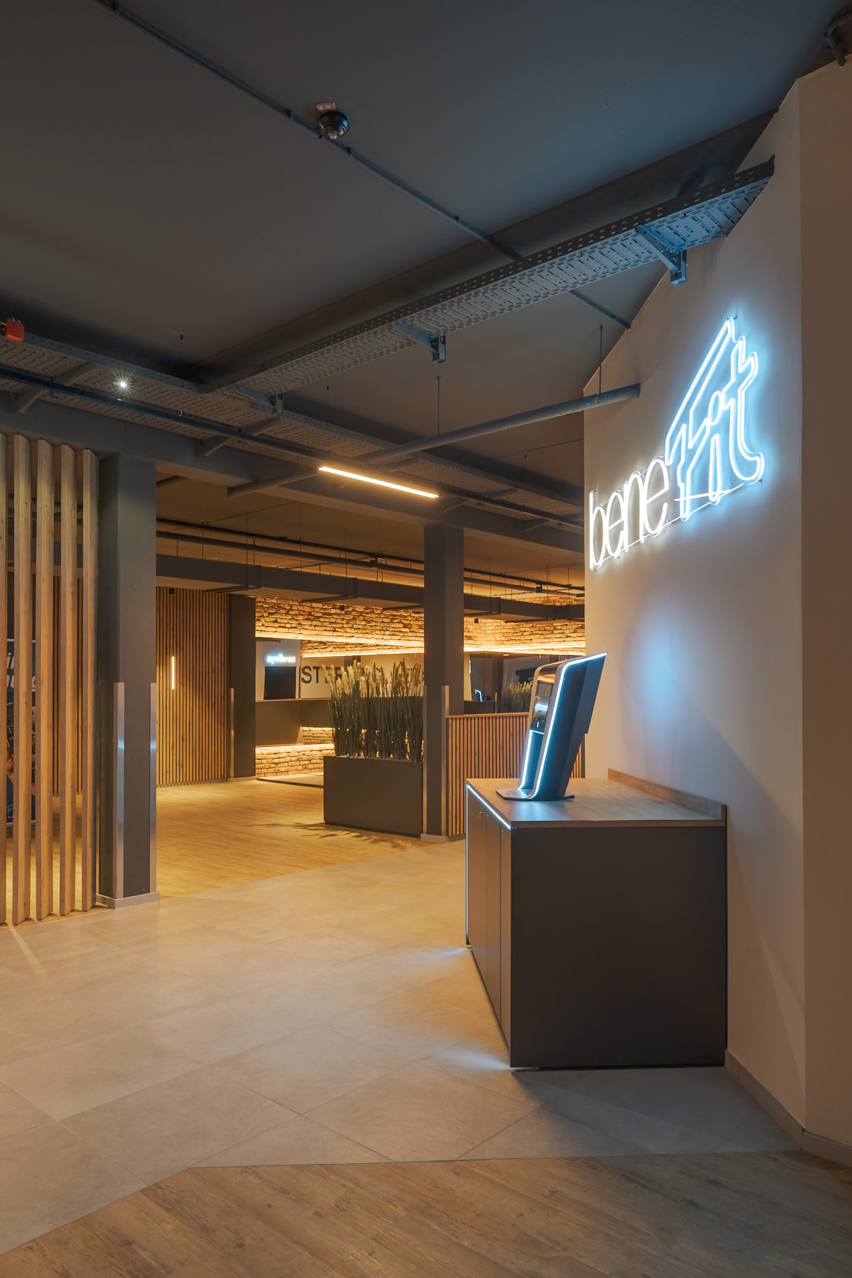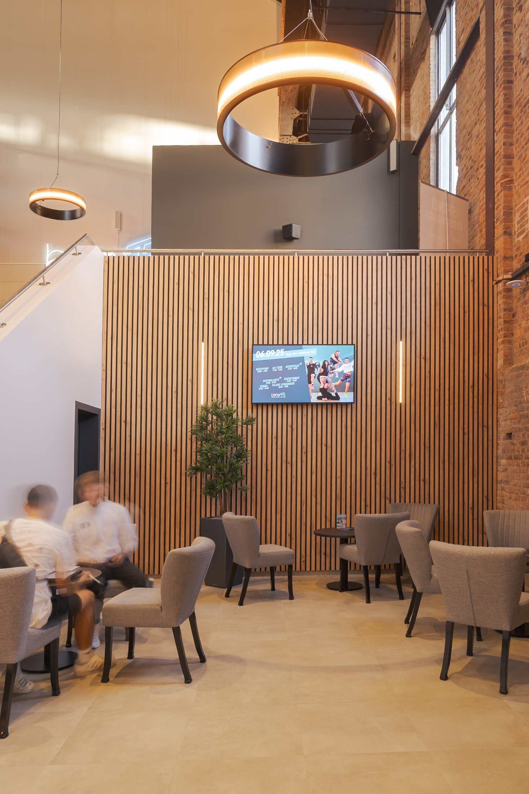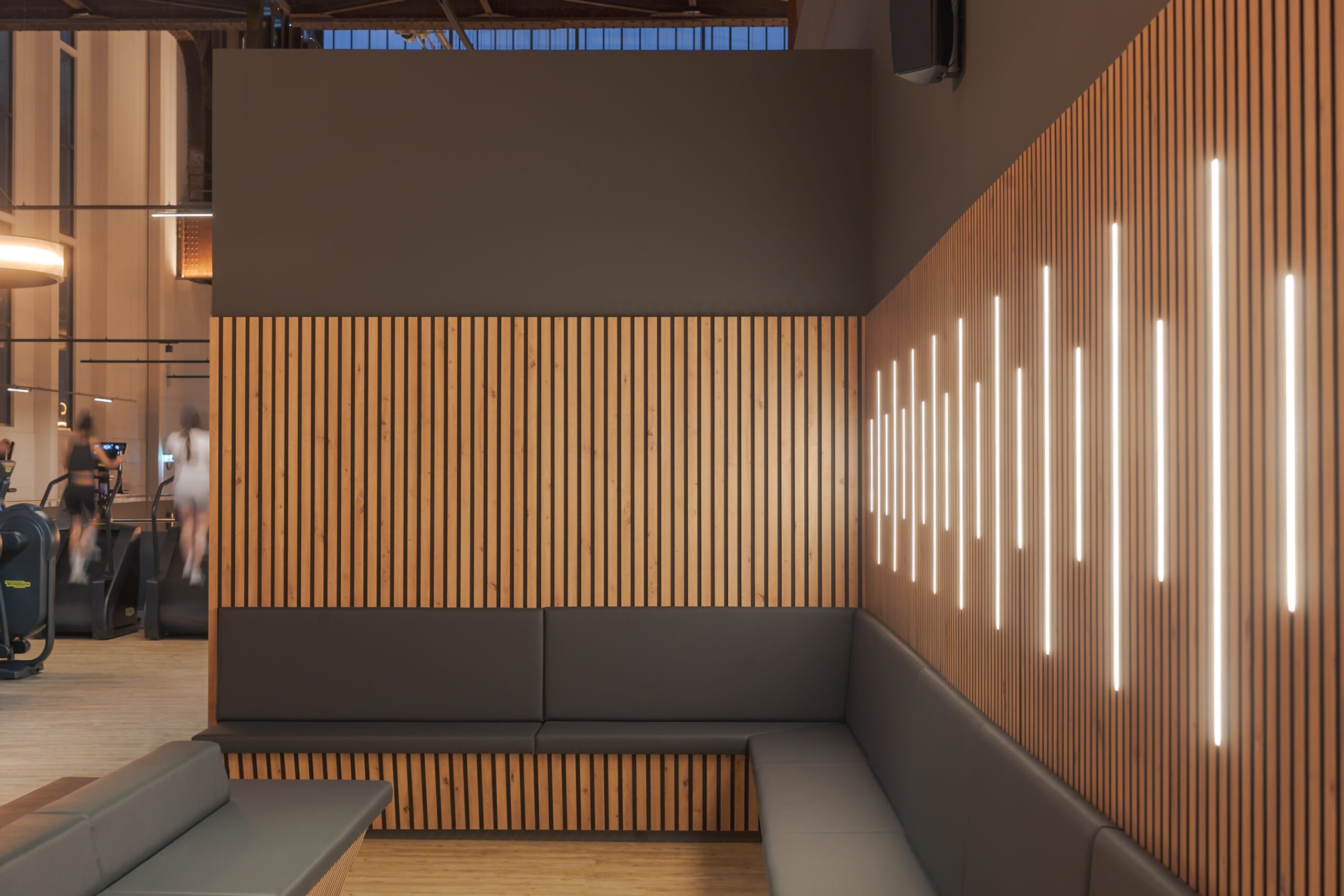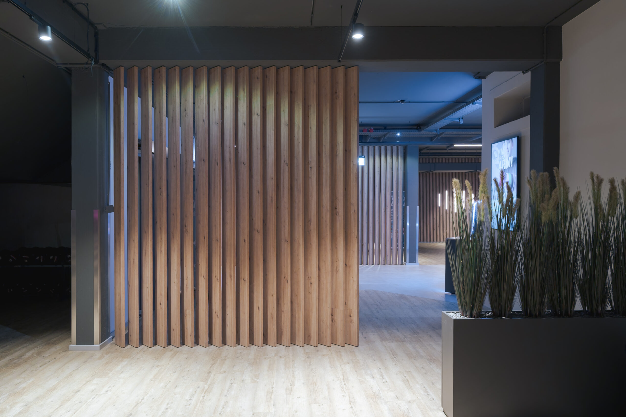 Architektur, Bewegung und Atmosphäre verschmelzen in diesen Fitness- und Raumkonzepten zu einem ganzheitlichen Erlebnis. Vertikale Holzlamellen strukturieren die Flächen, schaffen visuelle Tiefe und verleihen den Räumen eine natürliche Ruhe, die den industriellen Charakter der Architektur bewusst ausbalanciert. Die WoodUpp-Elemente wirken dabei nicht nur gestalterisch, sondern übernehmen zugleich eine funktionale Rolle als Raumteiler, Wandverkleidung und akustisch wirksames Gestaltungselement.