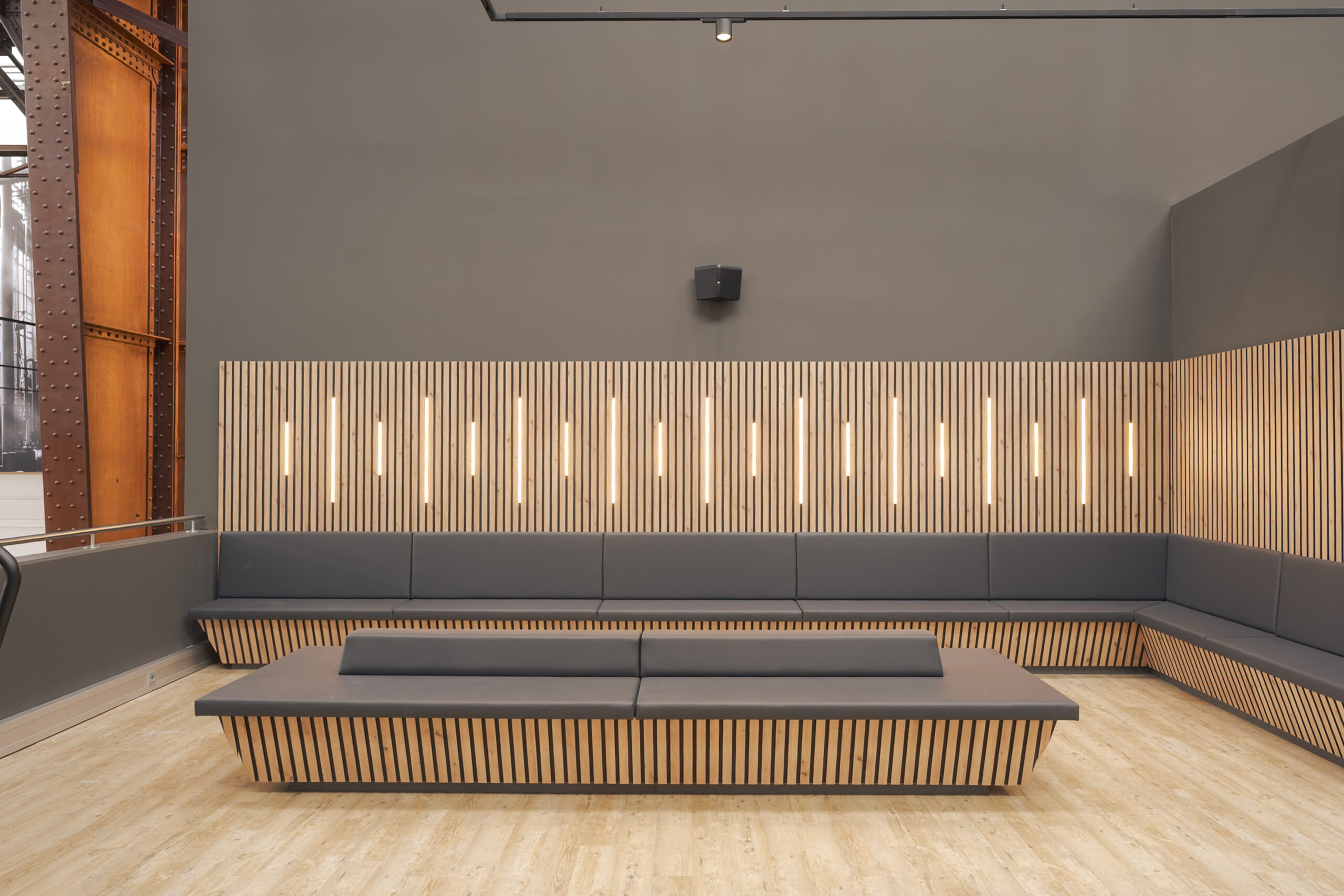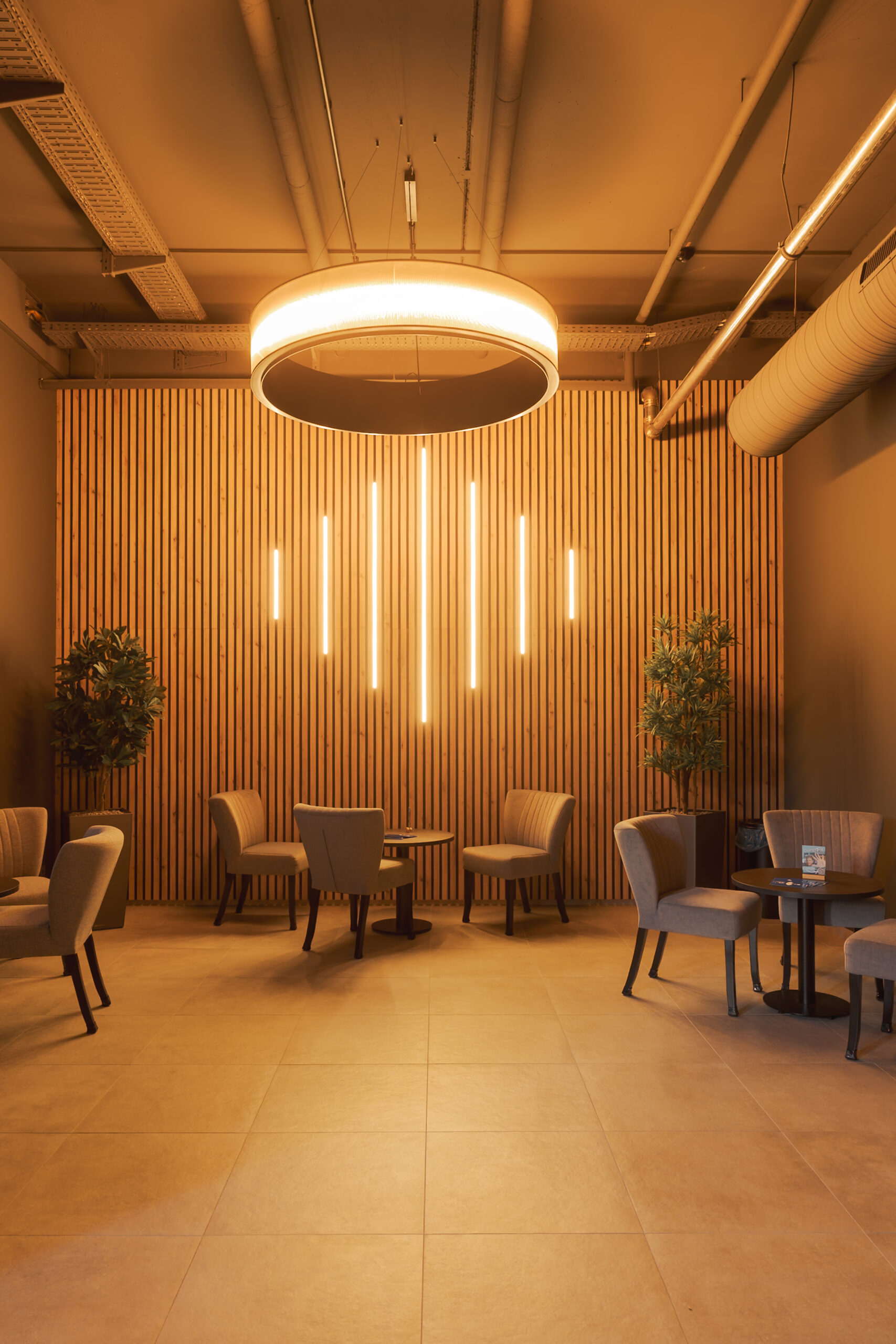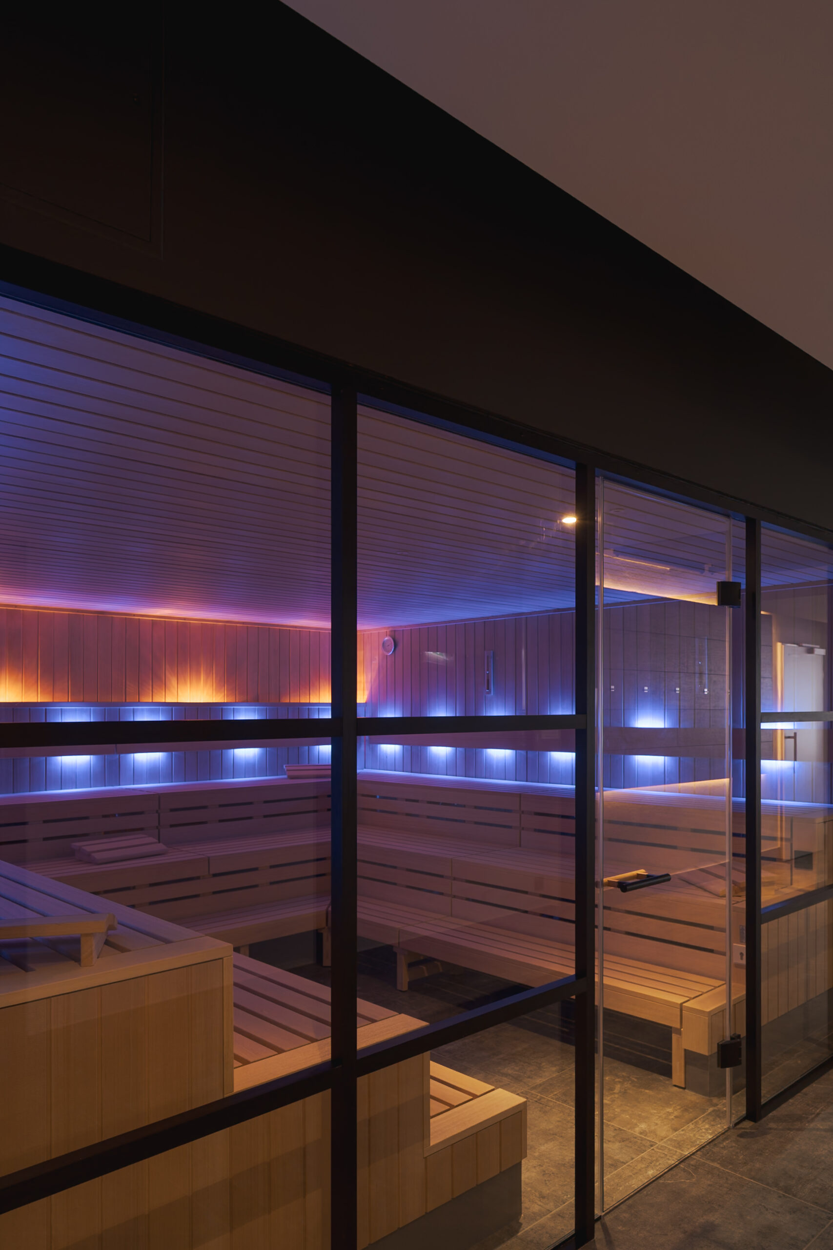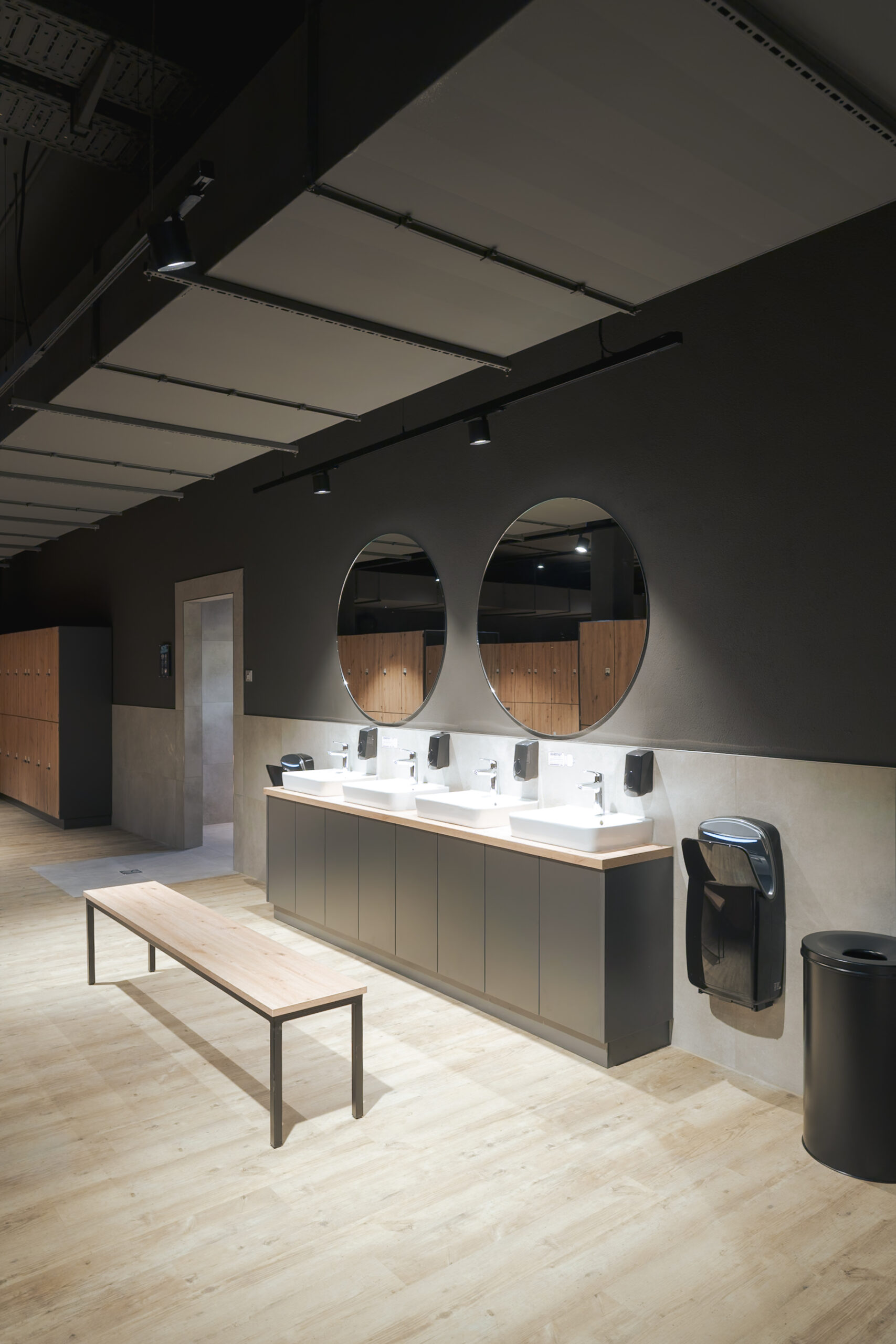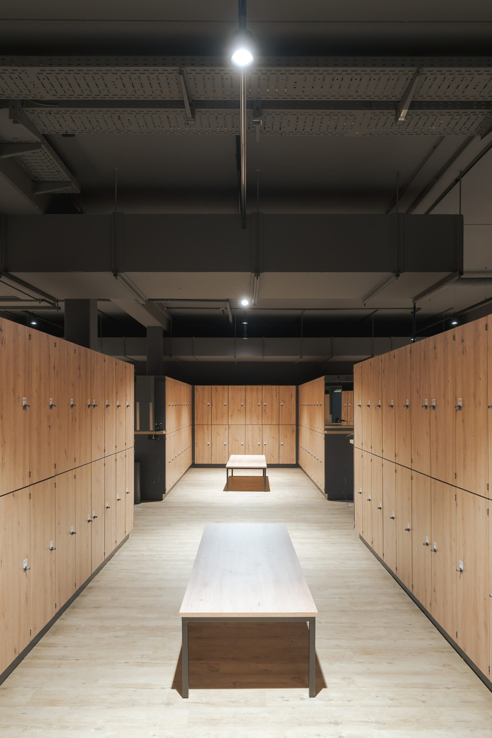 Gezielt integrierte Lichtlinien durchbrechen die rhythmische Struktur der Lamellen und setzen präzise Akzente. Sie führen den Blick, zonieren die Flächen und erzeugen eine dynamische Spannung zwischen Aktivität und Entspannung. Sitzlandschaften, Umkleidezonen und Übergangsbereiche werden so zu Orten der Ruhe, ohne ihre funktionale Klarheit zu verlieren.