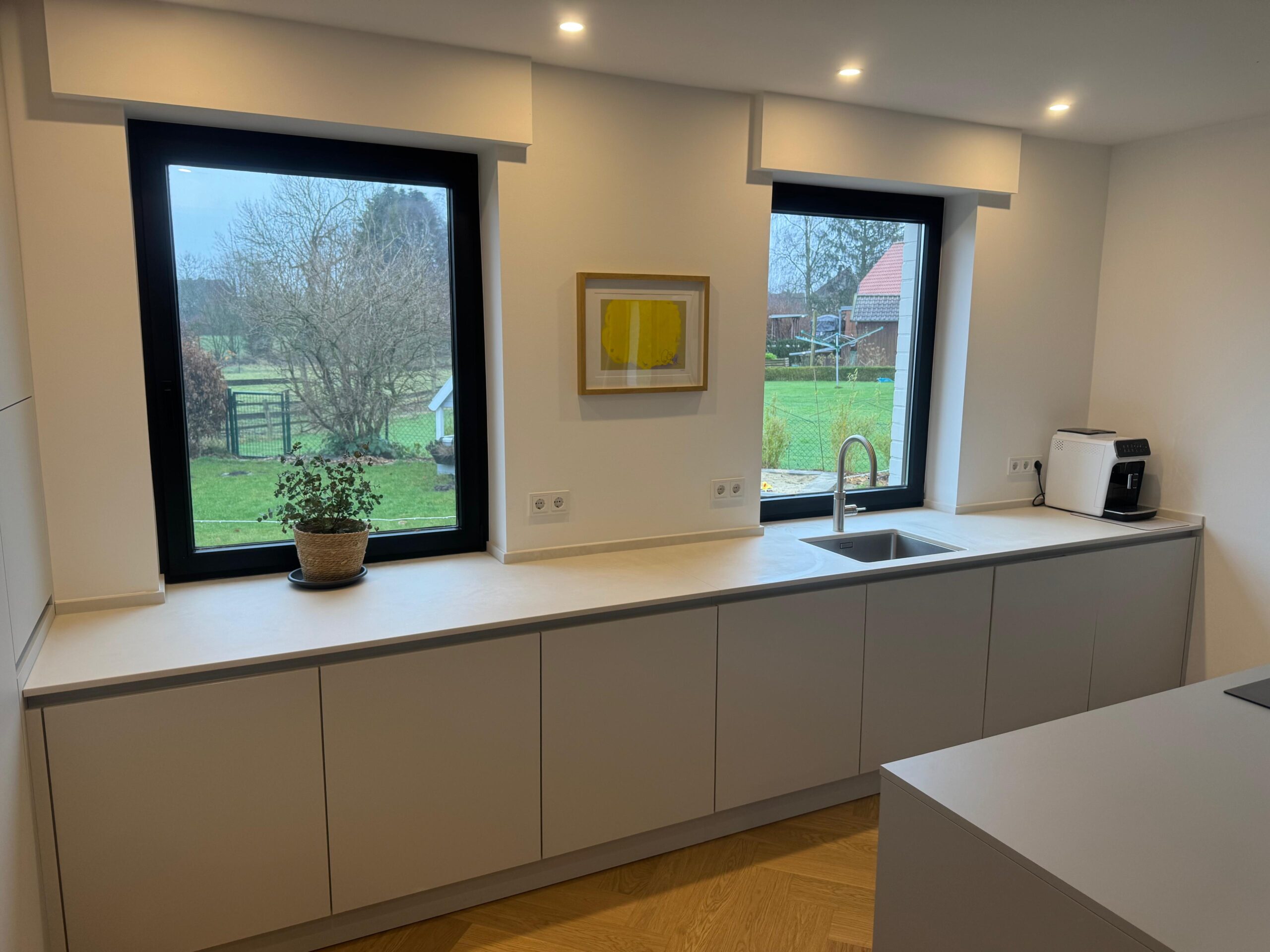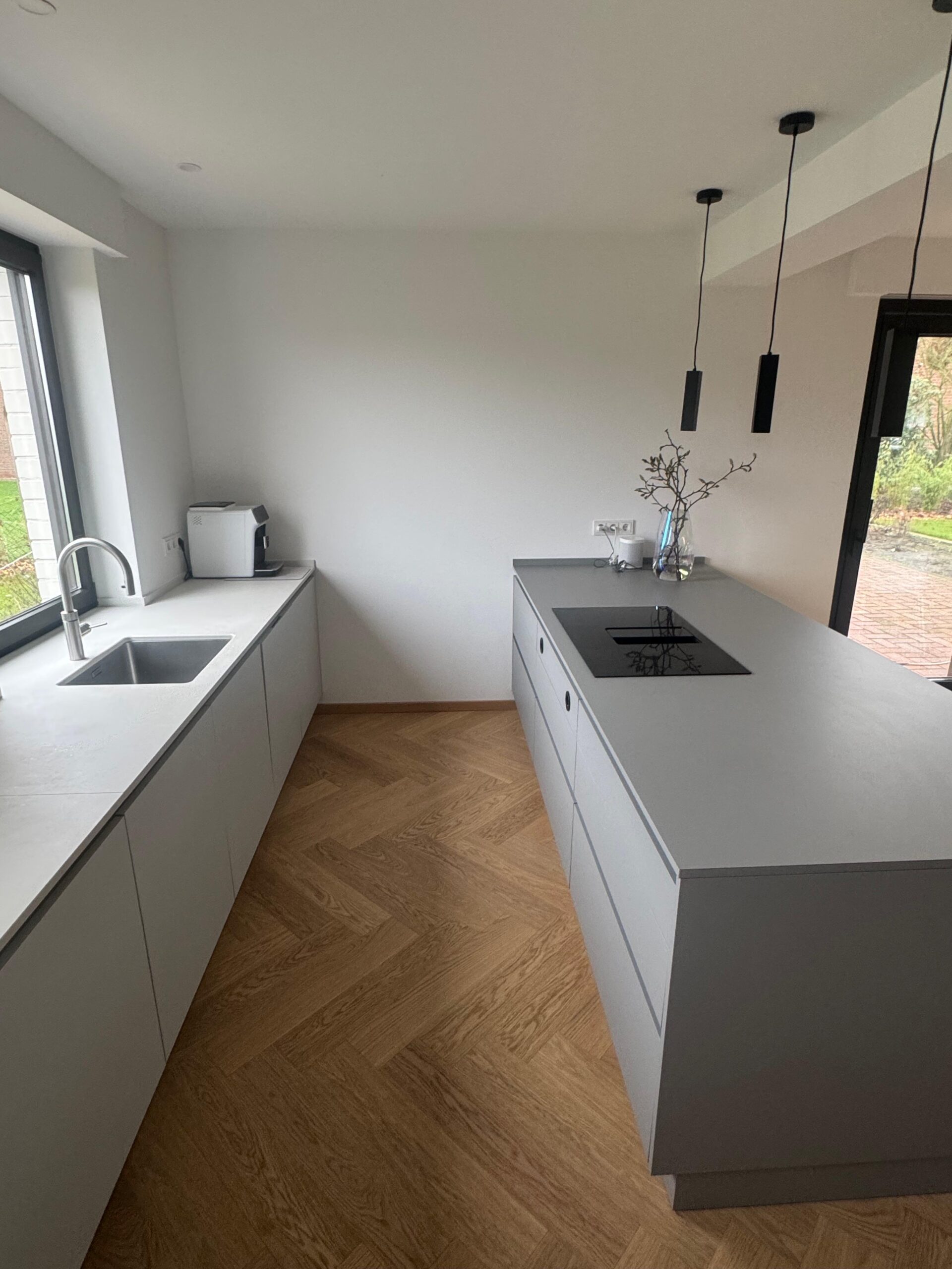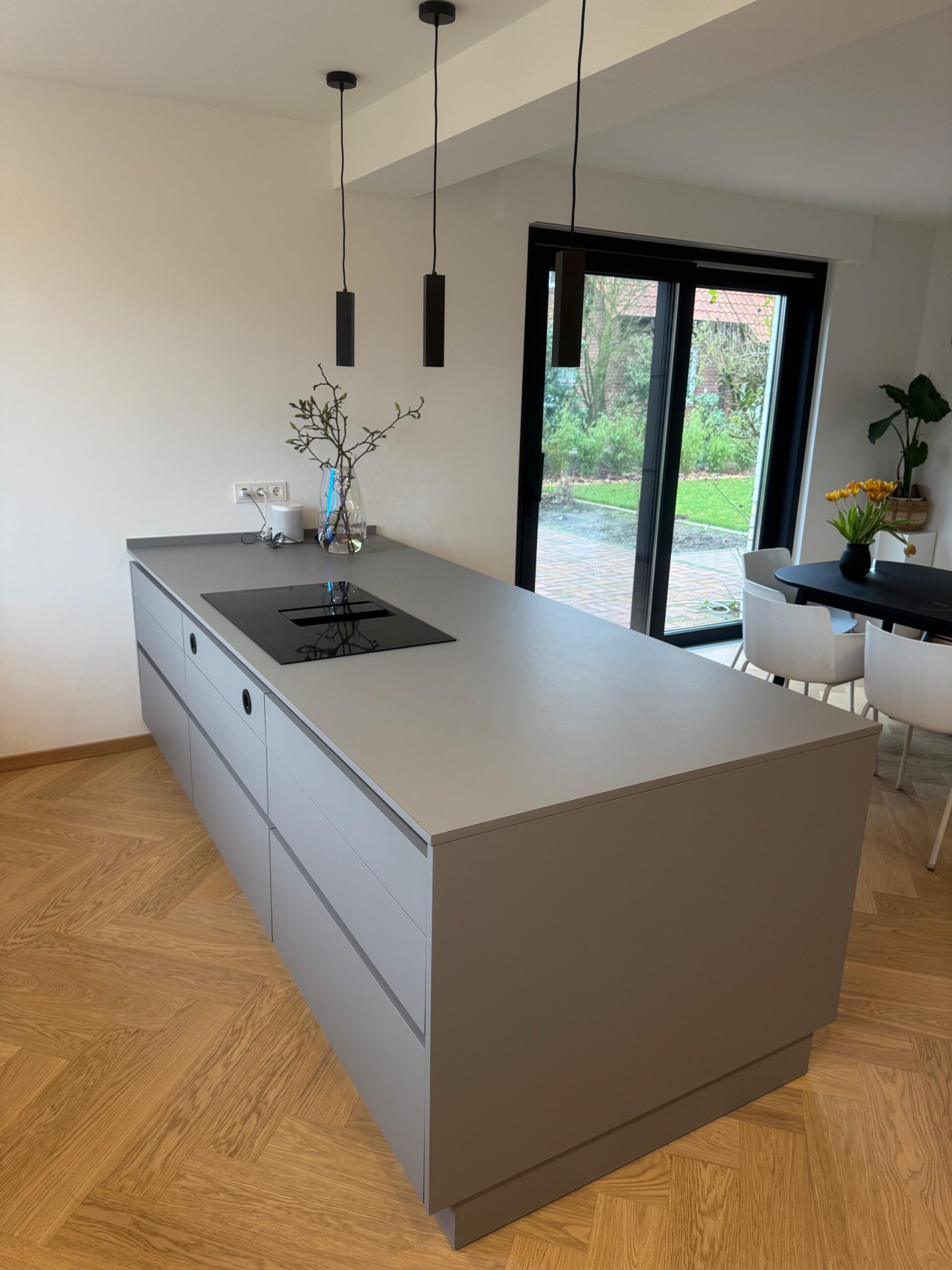 Im Mittelpunkt steht die großzügige Kücheninsel mit integrierter Kochfläche, die Funktionalität und Design perfekt miteinander verbindet. Sie bietet viel Arbeitsfläche und macht die Küche zum kommunikativen Zentrum des Raumes. Die farblich abgestimmte Arbeitsplatte ergänzt das reduzierte Gesamtbild und verstärkt die moderne Wirkung.