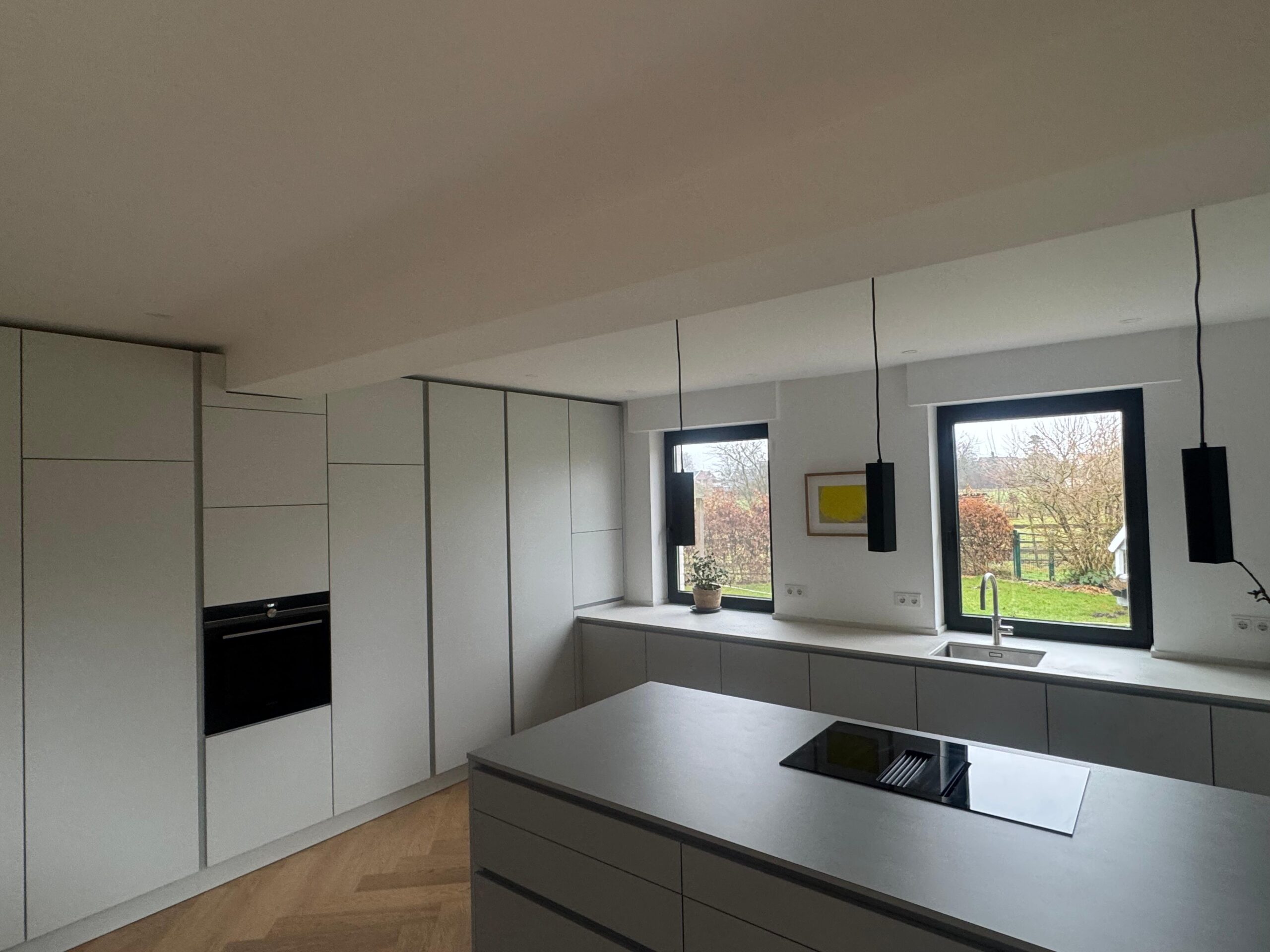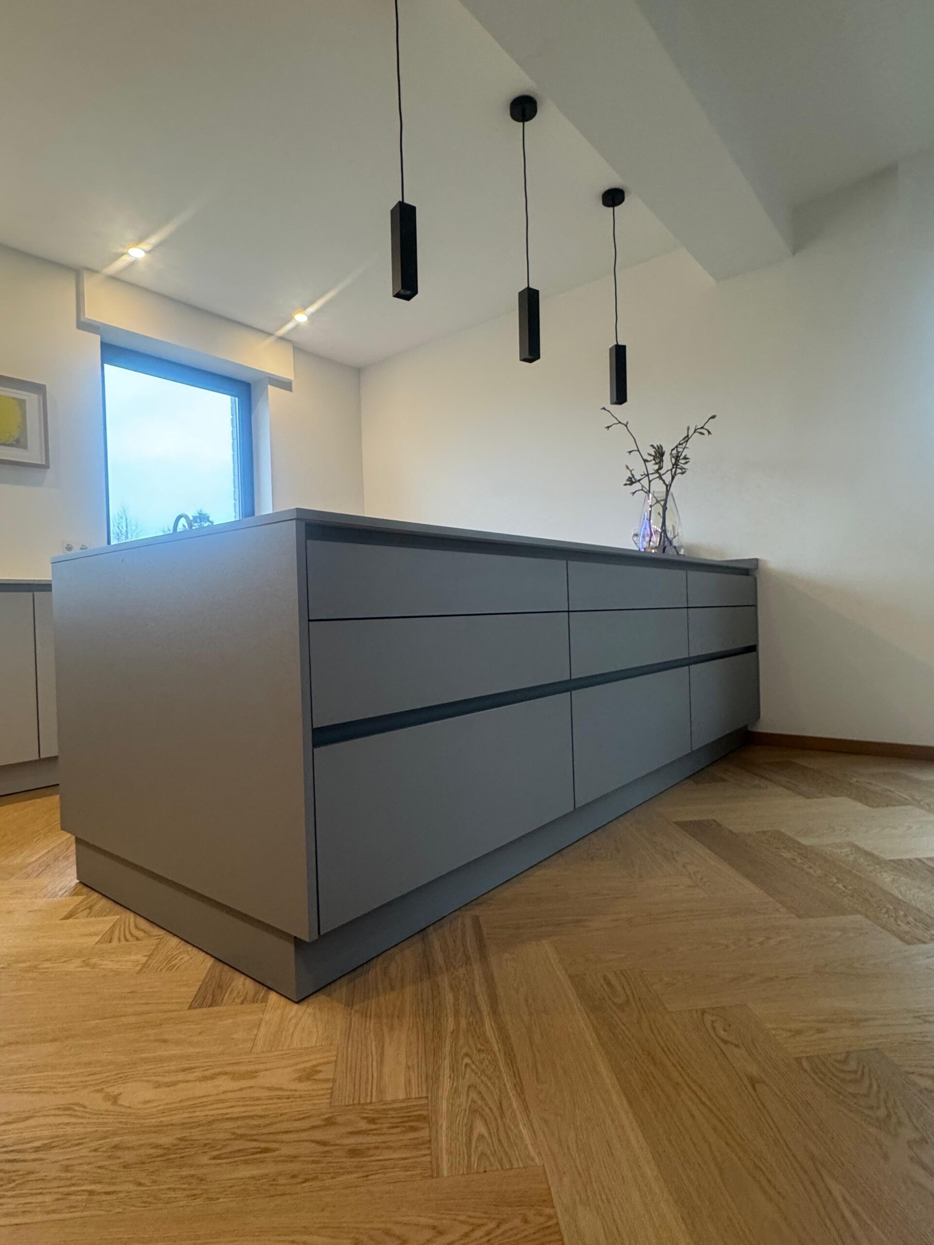 Große Fensterflächen sorgen für viel Tageslicht und setzen die graue Designküche wirkungsvoll in Szene. Schwarze Details wie Pendelleuchten, Geräte und Armaturen schaffen gezielte Kontraste und verleihen der Küche eine elegante Tiefe. Der warme Holzboden bildet dazu einen natürlichen Ausgleich und bringt Wohnlichkeit in das moderne Raumkonzept.