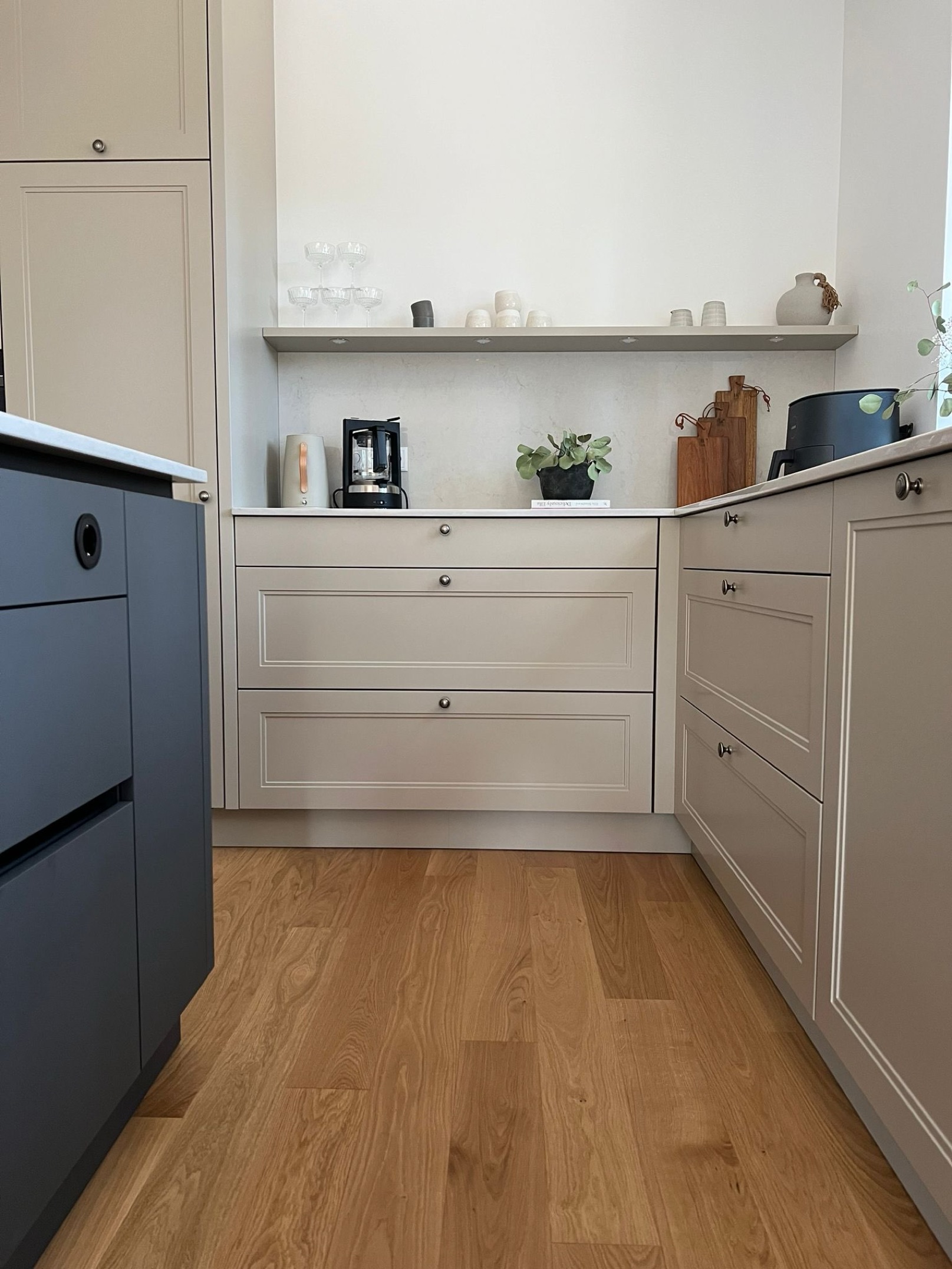 Diese Küche kombiniert klassische Kassettenfronten in hellem Sandbeige mit einer tiefblauen Kücheninsel und schafft so ein ausgewogenes Spiel zwischen Tradition und Moderne. Die fein abgestimmte Farbpalette aus Naturtönen, strukturiertem Holz und sattem Anthrazit erzeugt eine wohnliche Atmosphäre mit modernem Anspruch.