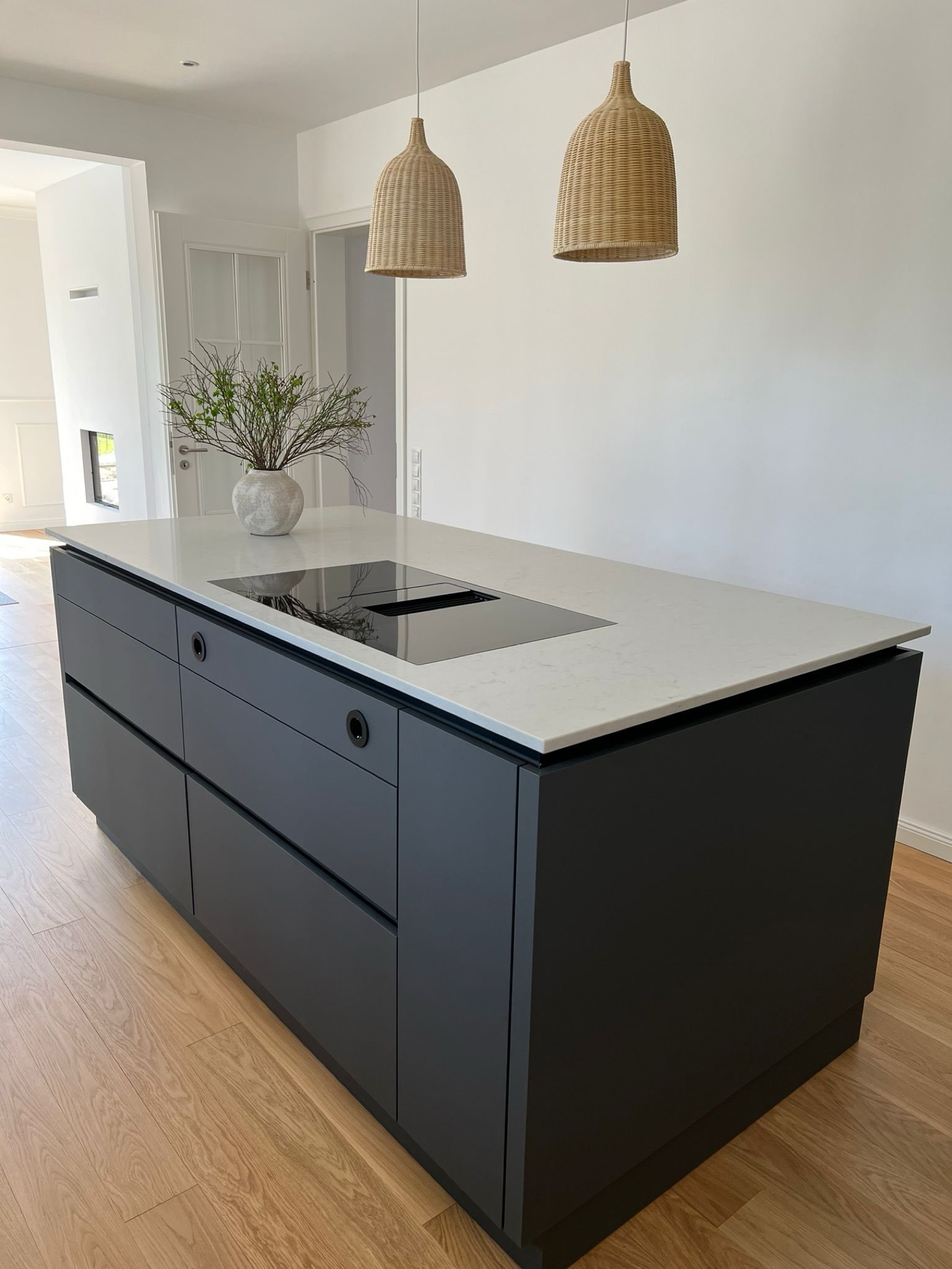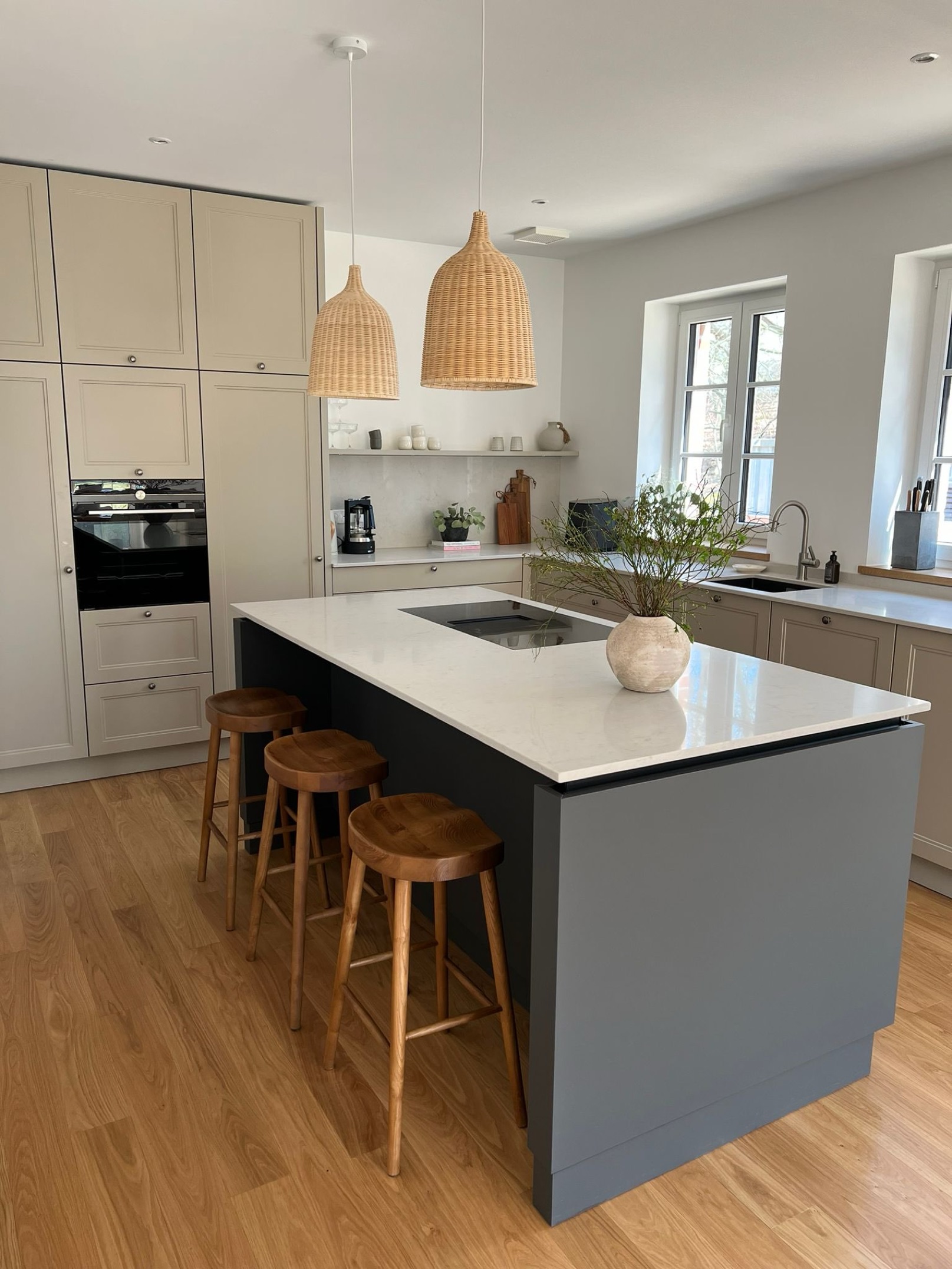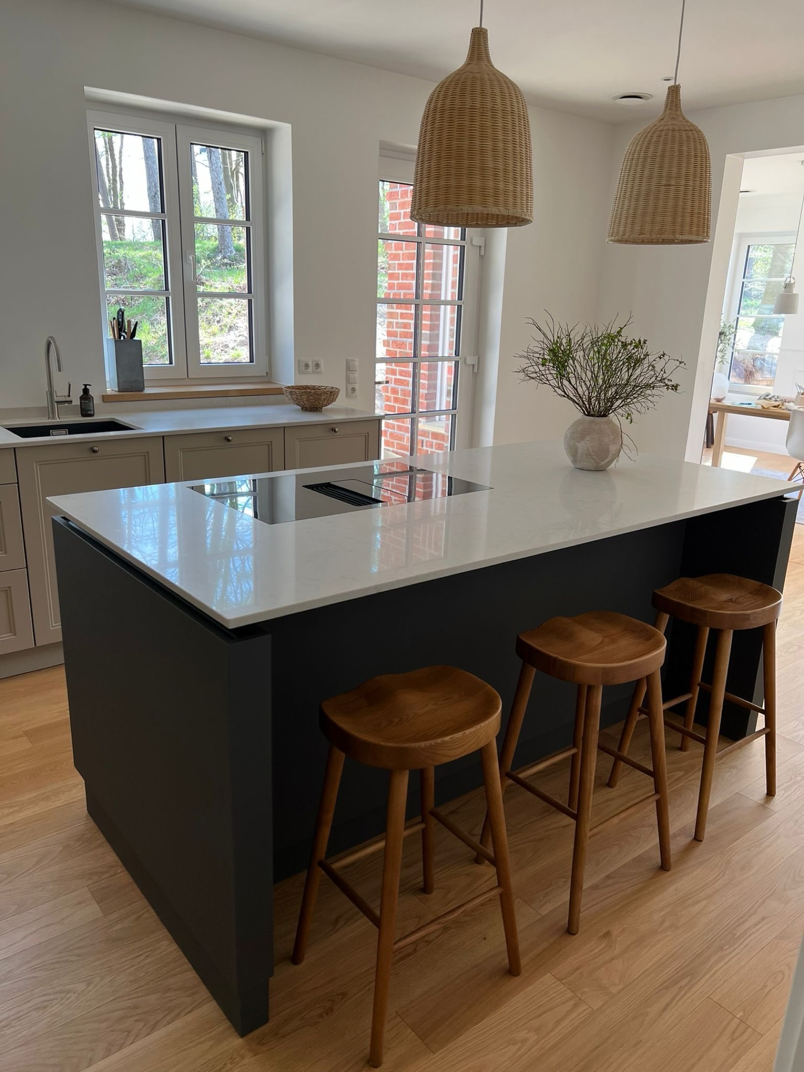 Im Zentrum steht die Kücheninsel mit großzügiger Kochfläche, weißer Quarzstein-Arbeitsplatte und eleganter Barlösung. Die natürlichen Holzbarhocker und geflochtenen Pendelleuchten fügen sich perfekt in das Gesamtbild ein und unterstreichen den handwerklichen Charakter. Großzügige Fensterflächen sorgen für viel Tageslicht und setzen die hochwertigen Materialien wirkungsvoll in Szene.