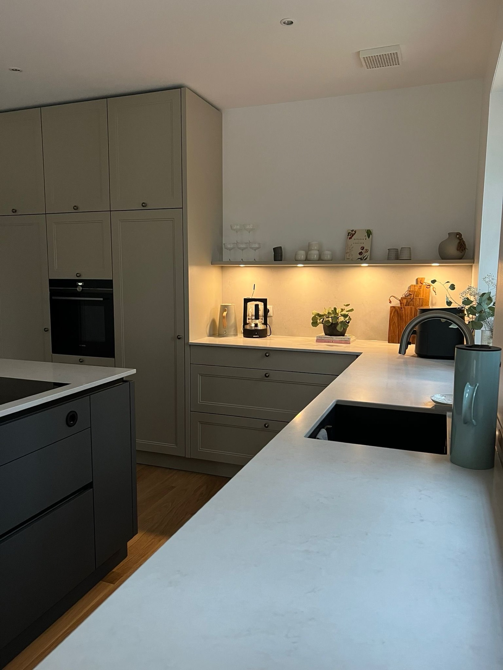Die grifflose Gestaltung der Insel wird durch klassisch gerahmte Fronten im übrigen Küchenbereich ergänzt. In der Wandzeile befindet sich eine stimmig integrierte Nische mit Ablageboard und LED-Spots – ideal als Kaffee- oder Frühstücksbereich. Schwarze Akzente wie Armatur, Geräte und Details an der Insel fügen sich zurückhaltend, aber stilbildend ein.