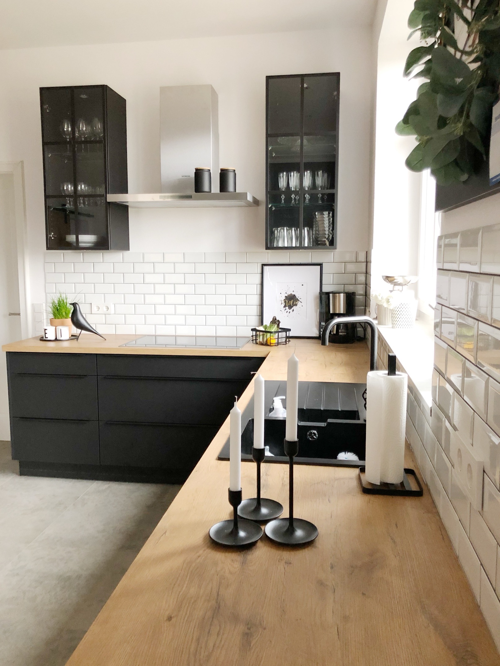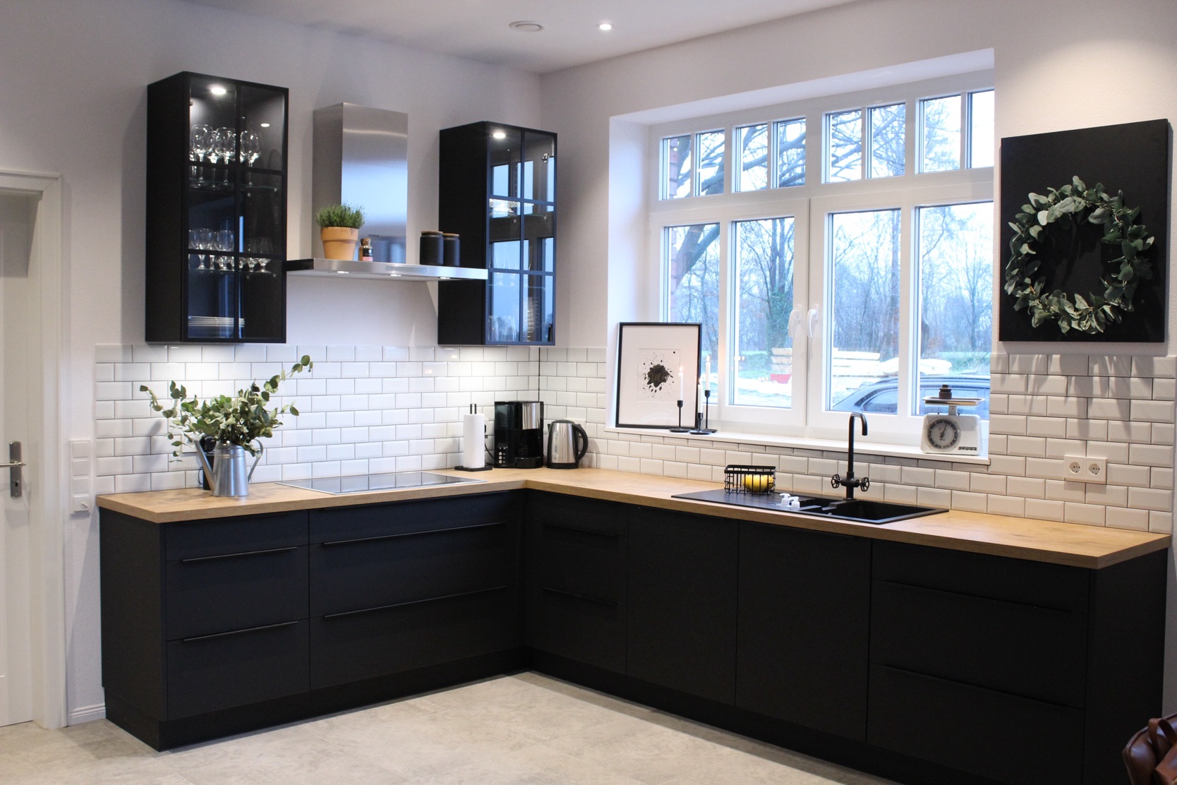 Diese Küche lebt vom spannungsvollen Zusammenspiel aus mattschwarzen Fronten und einer natürlich gemaserten Holzarbeitsplatte. Die Kombination vermittelt Eleganz und Bodenständigkeit zugleich – ergänzt durch eine klassische weiße Fliesenrückwand im Metro-Stil, die für ein helles und klares Ambiente sorgt.
