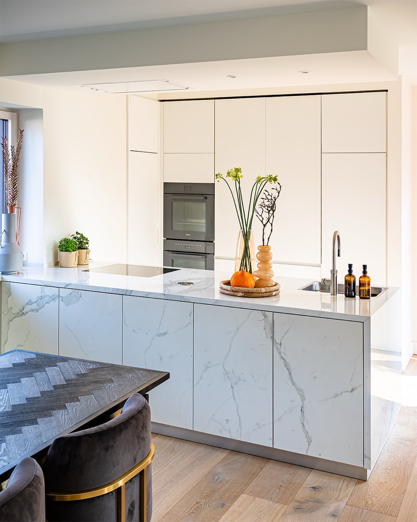 Diese Küche besticht durch ihre fast skulpturale Erscheinung. Die grifflosen Fronten sind vollständig in marmorweißer Optik ausgeführt – sowohl bei den Schränken als auch bei der großen Kücheninsel. Die durchgehende Maserung sorgt für ein ruhiges, flächiges Gesamtbild. Edel integriert: ein versenkbares Steckdosenelement in gebürstetem Edelstahl sowie eine minimalistische Unterbauspüle auf der Insel.