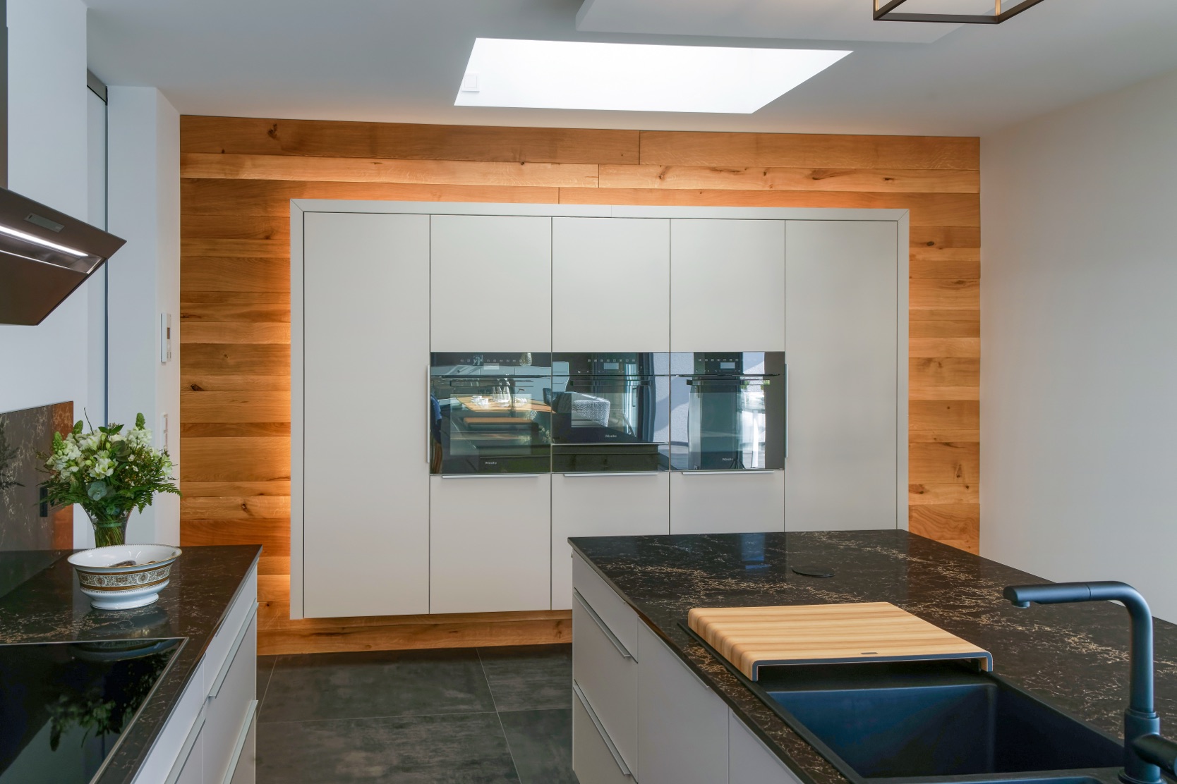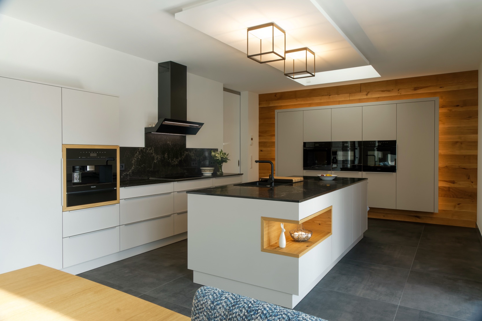 Diese Küche spielt gekonnt mit Gegensätzen: Die hellen, matten Fronten in Weiß und die markanten Arbeitsflächen aus dunklem Naturstein schaffen eine elegante, fast grafische Wirkung. Gleichzeitig sorgen durchdachte Holzdetails – wie die integrierte Nische in der Kochinsel und die hinterleuchtete Rückwandverkleidung aus massiver Eiche – für warme, wohnliche Akzente.