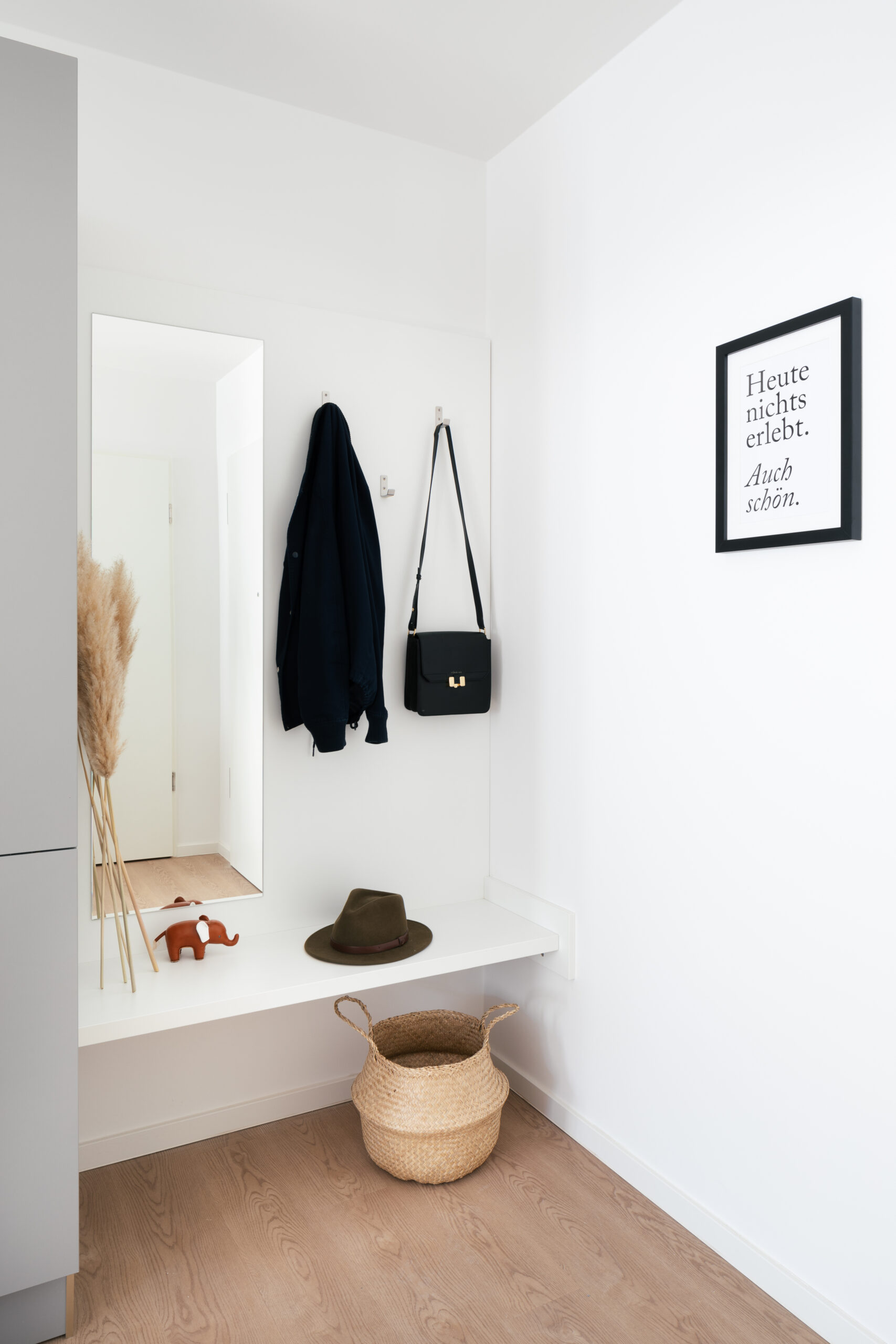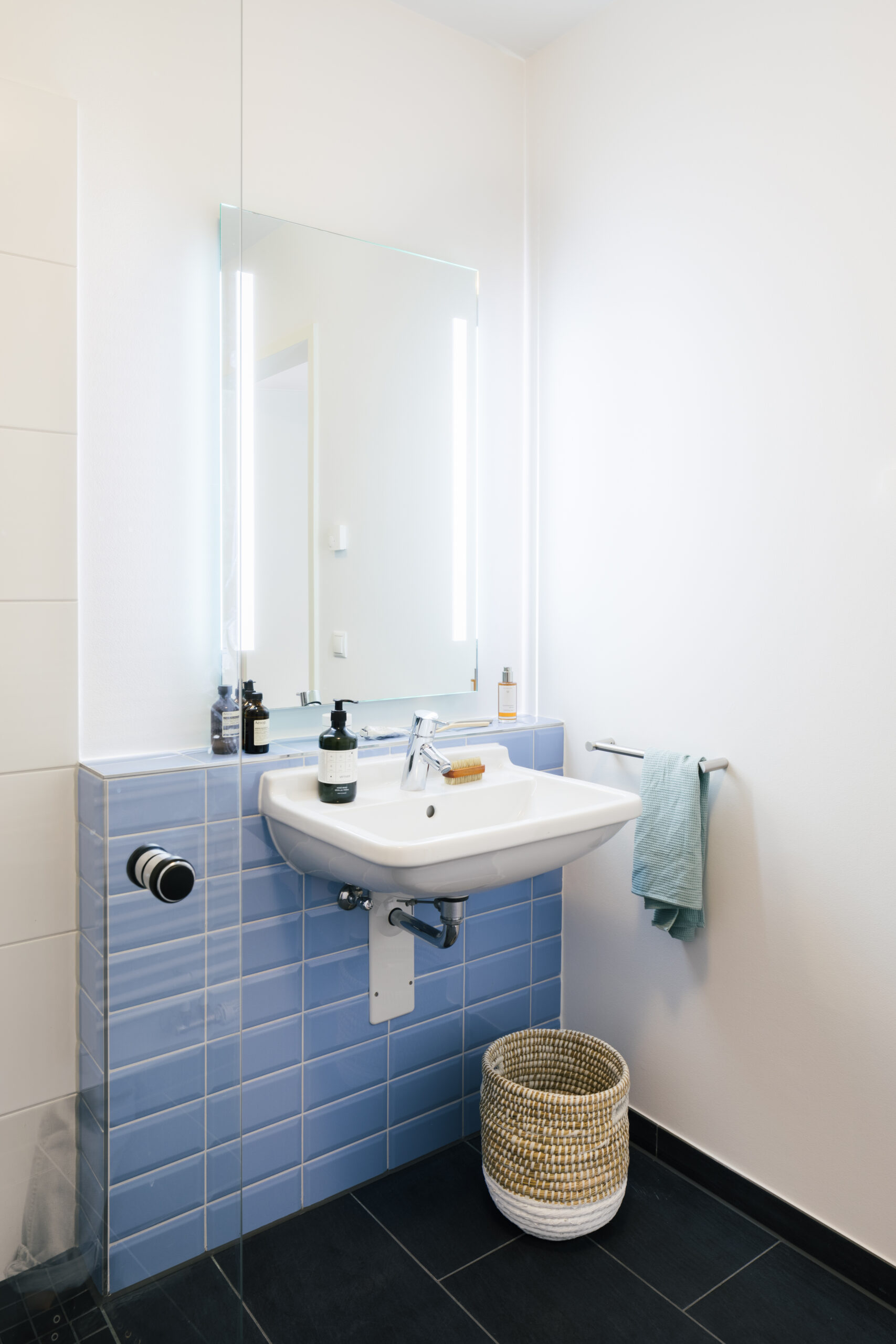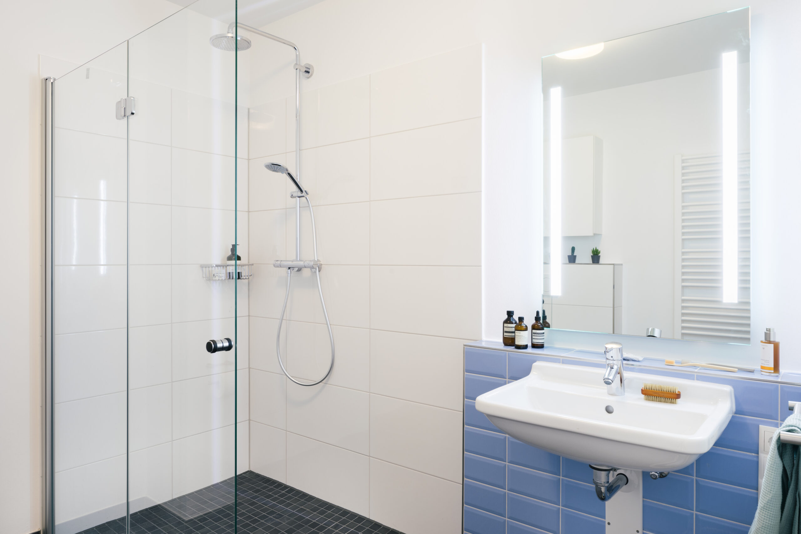Das Bad präsentiert sich puristisch und hochwertig: klare Formen, helle Oberflächen, großformatige Spiegel und reduzierte Armaturen schaffen ein zeitloses, gepflegtes Ambiente. So entsteht ein Mikroapartment, das Funktionalität, Komfort und Design souverän vereint.