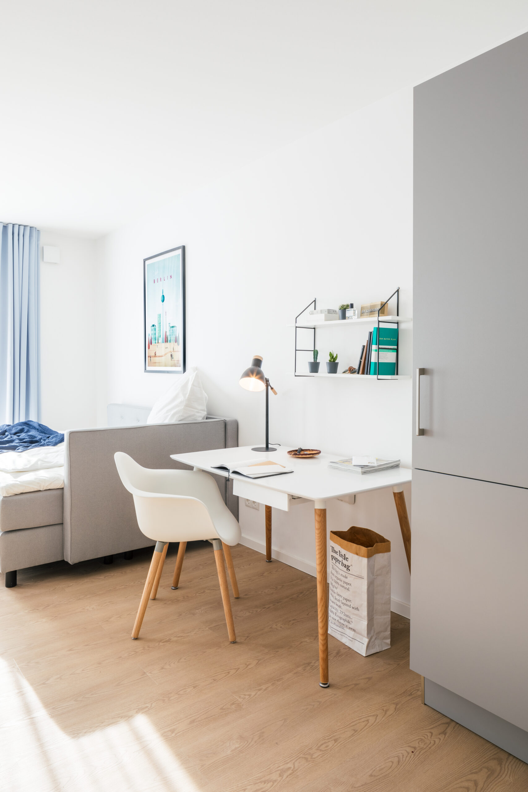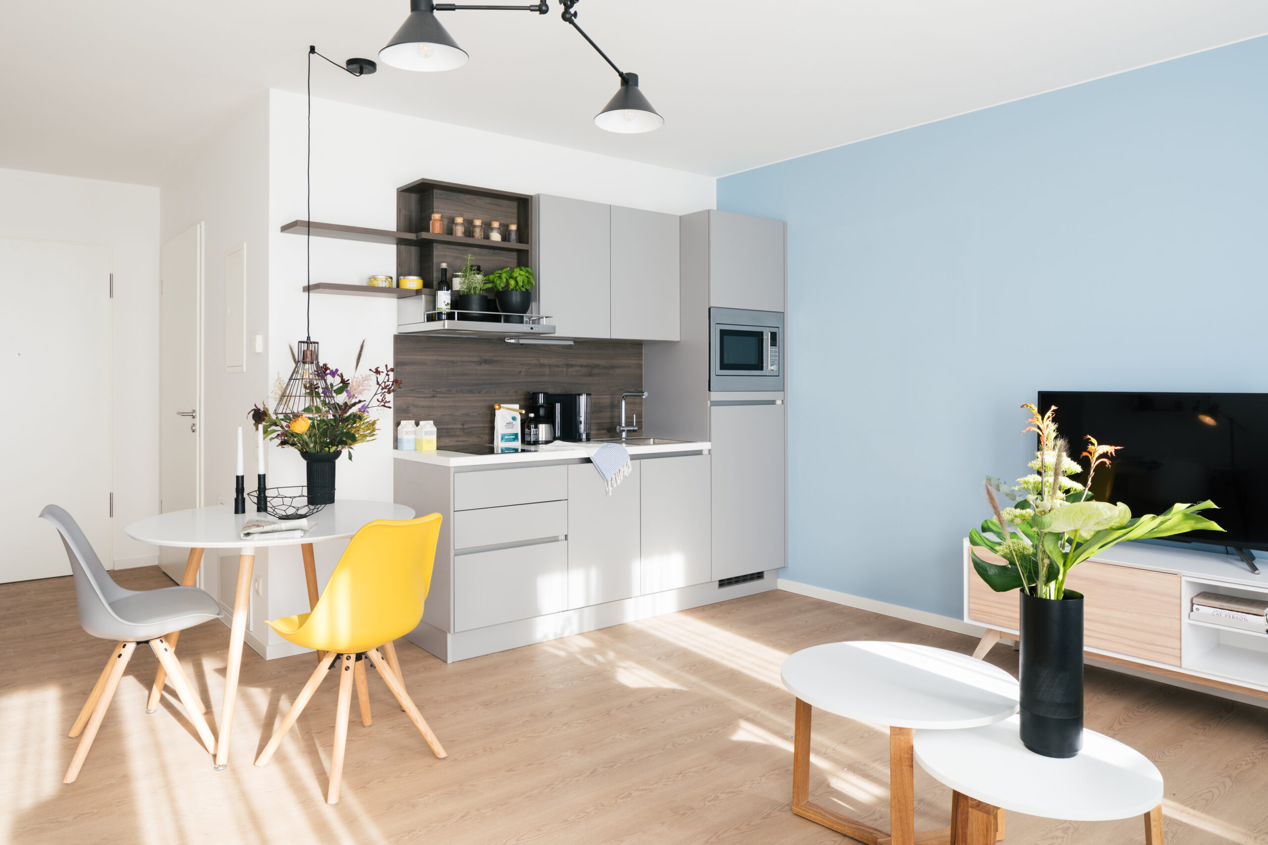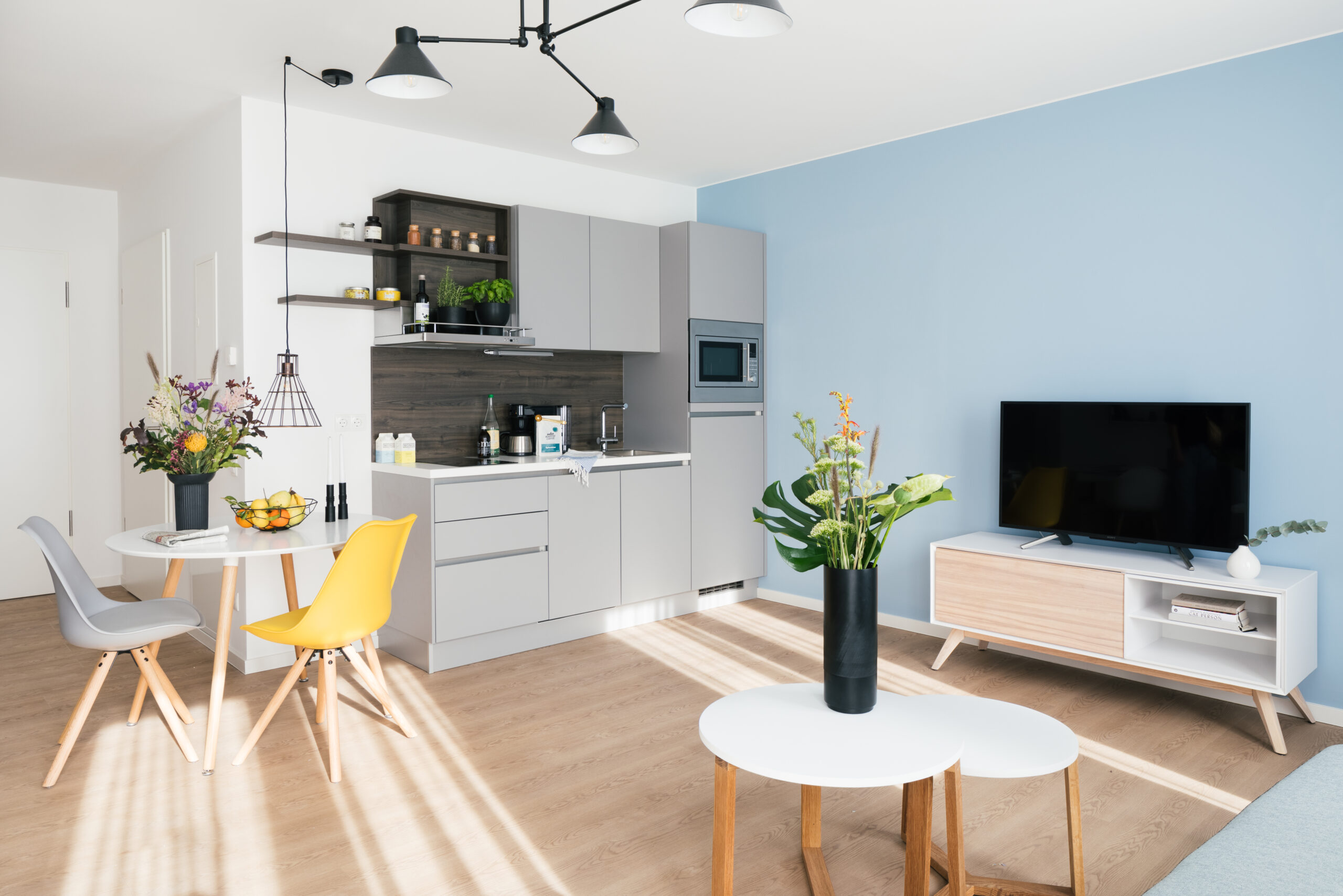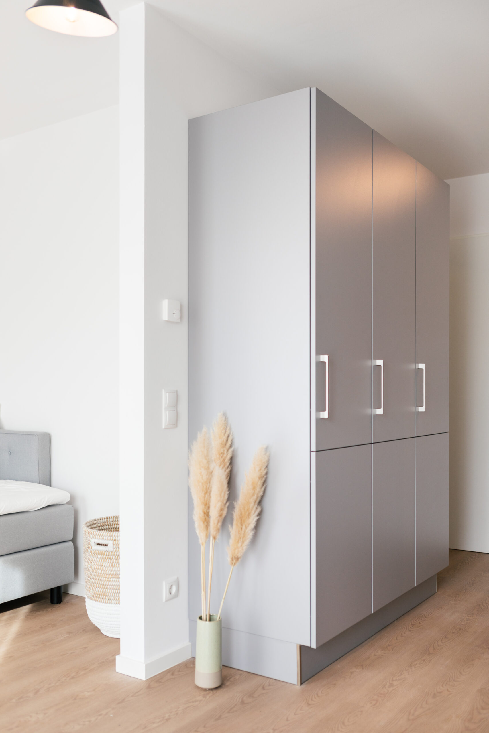 Das Mikroapartment verbindet modernes Design mit wohnlicher Wärme und schafft auf kleiner Fläche ein durchdachtes, harmonisches Raumgefühl. Helle Farben, klare Linien und natürliche Holzoberflächen sorgen für eine freundliche, offene Atmosphäre und lassen den Raum größer wirken.