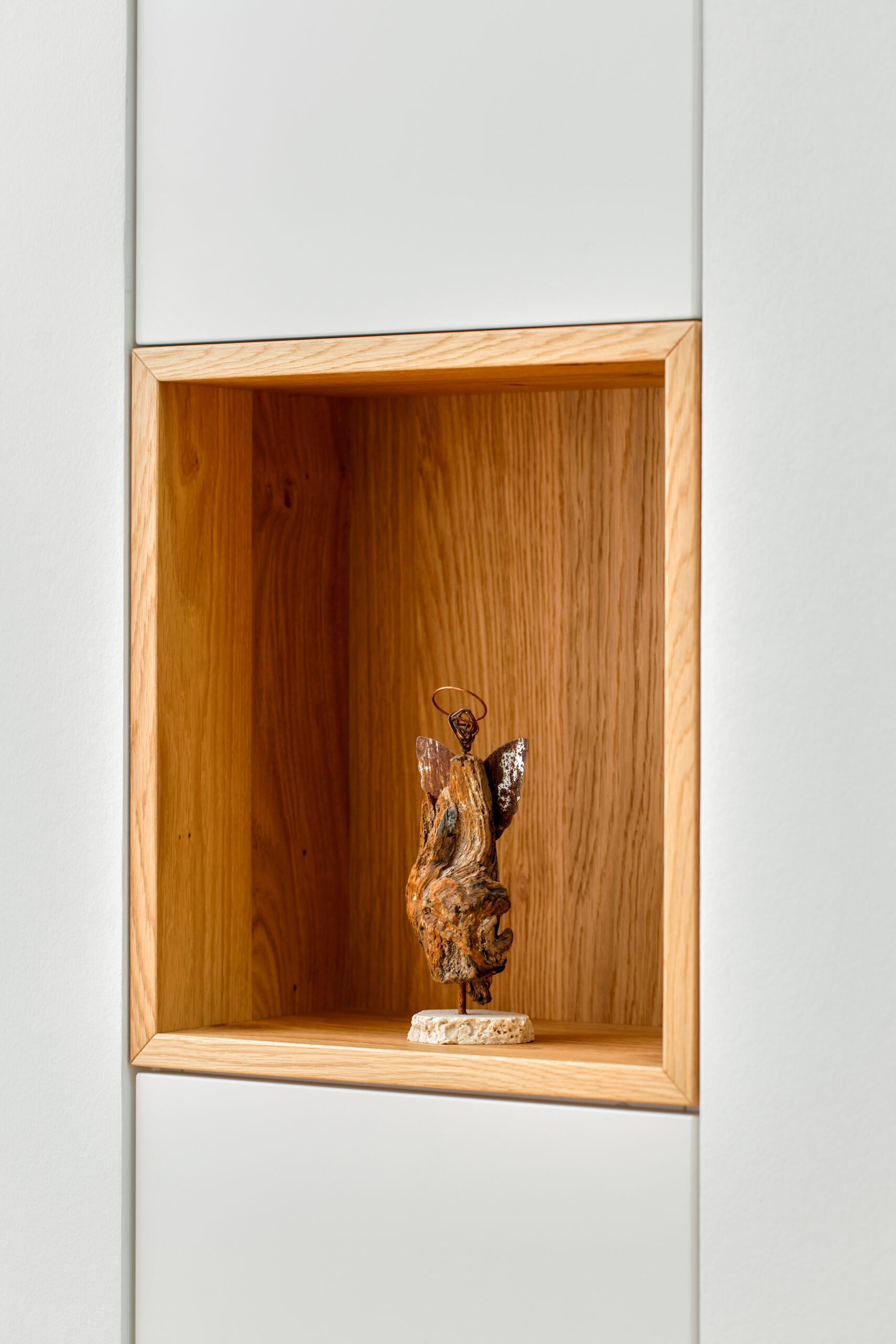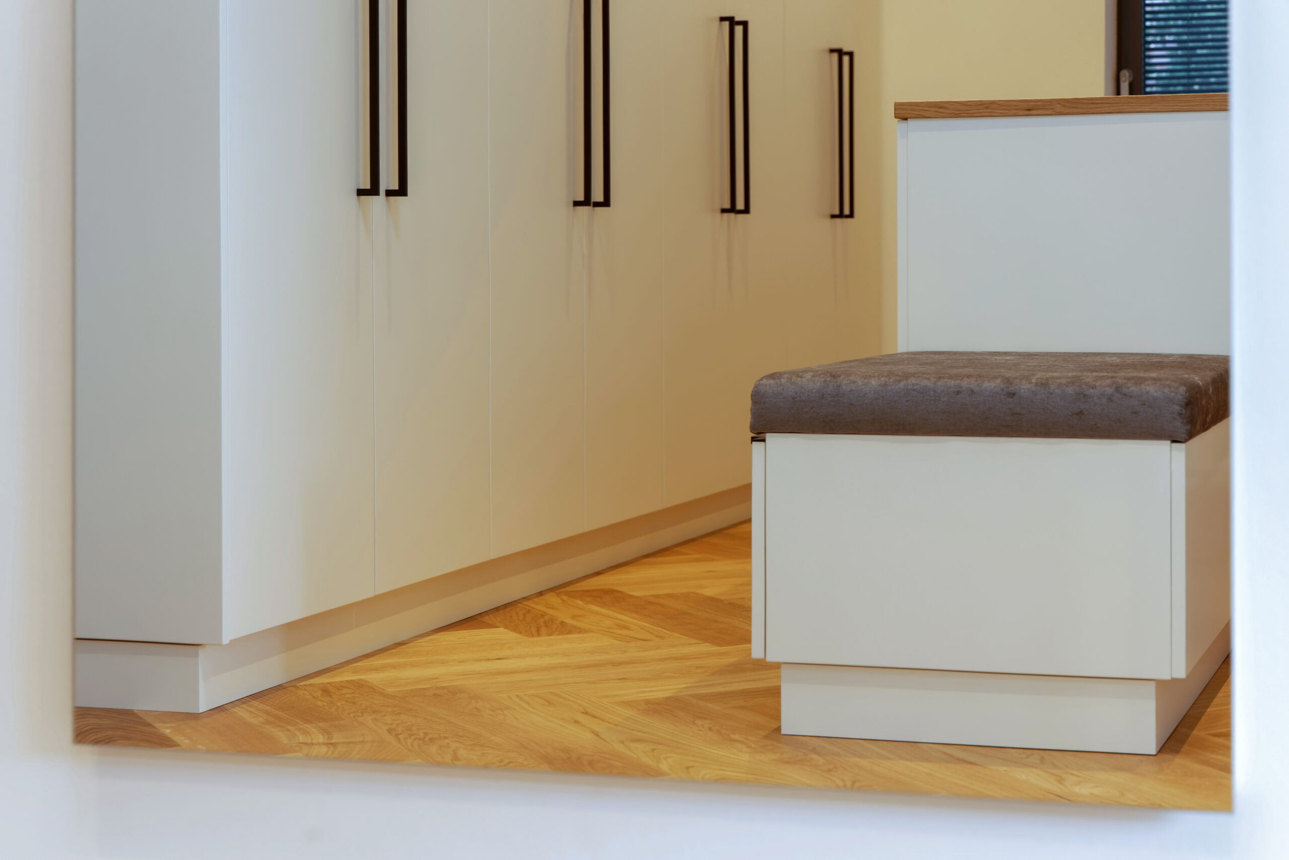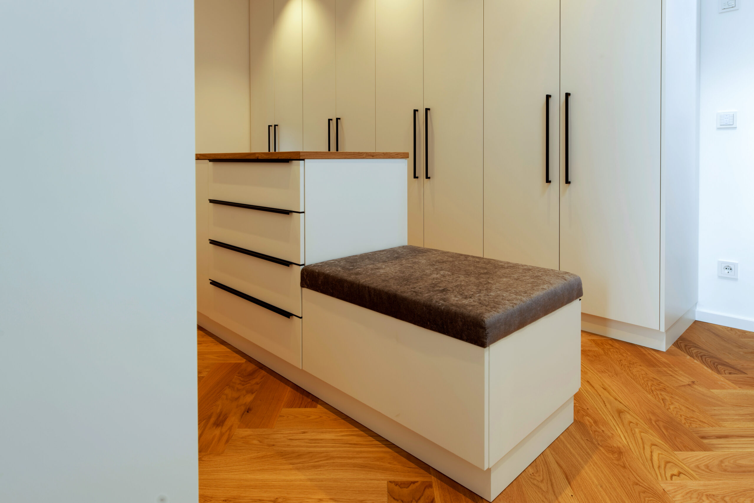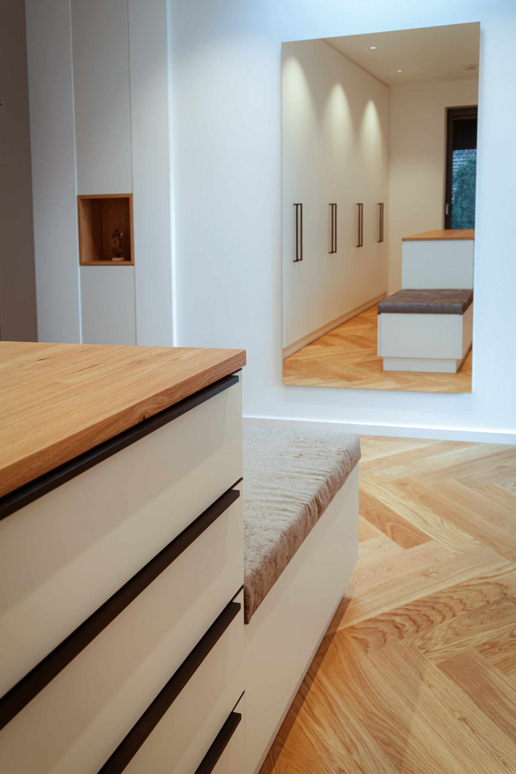 Warme Holzelemente – wie die massive Holzabdeckung der Mittelkommode sowie die integrierte Nische – bringen natürliche Wärme in das klare Design und sorgen für eine wohnliche Atmosphäre. Die zentral platzierte Sitzbank mit gepolsterter Oberfläche verbindet Komfort mit Funktion und macht das Ankleiden besonders angenehm.