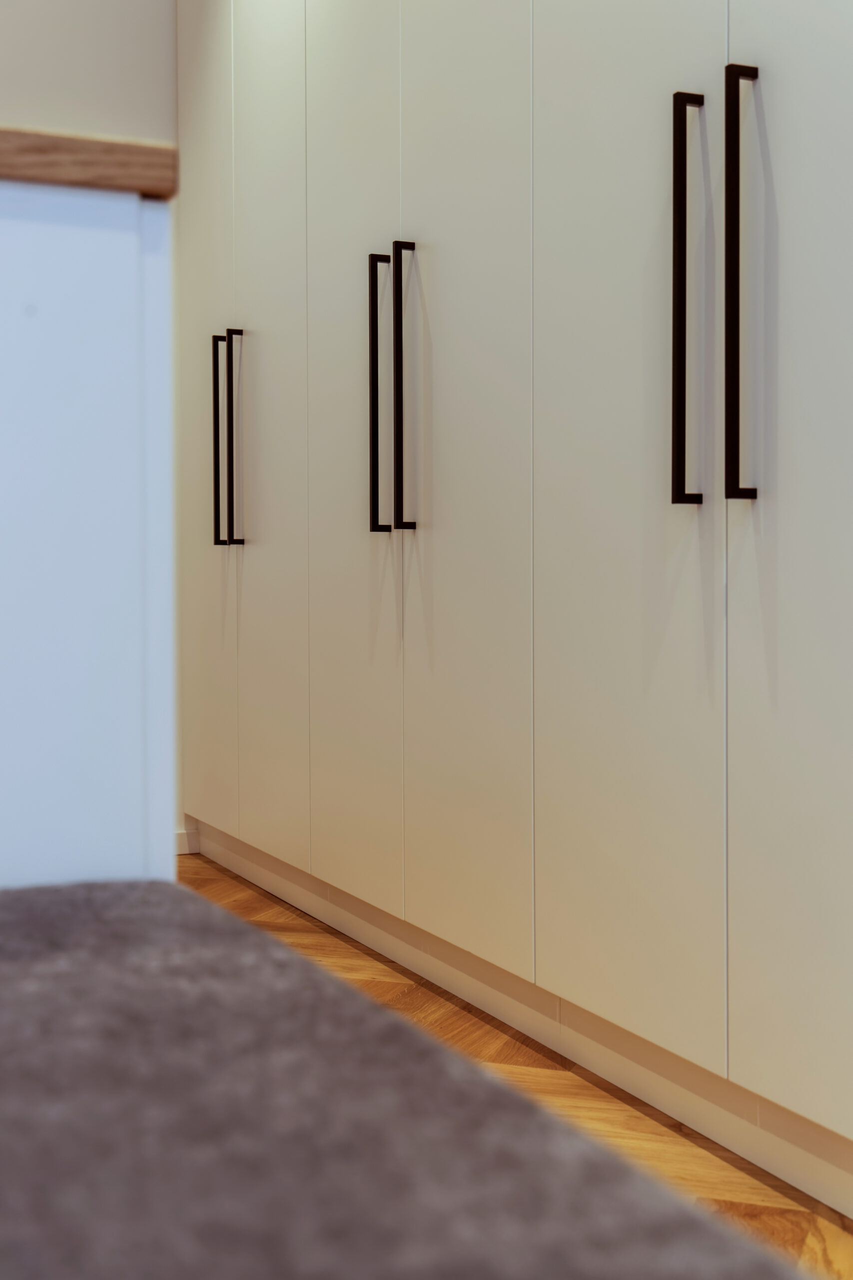 Diese Ankleide steht für zeitloses Design, durchdachte Funktionalität und hochwertige Materialien. Die raumhohen Schrankfronten in elegantem Weiß schaffen eine ruhige, aufgeräumte Optik und lassen den Raum großzügig und lichtdurchflutet wirken. Schwarze Griffleisten setzen gezielte Kontraste und unterstreichen den modernen Charakter der Ankleide.